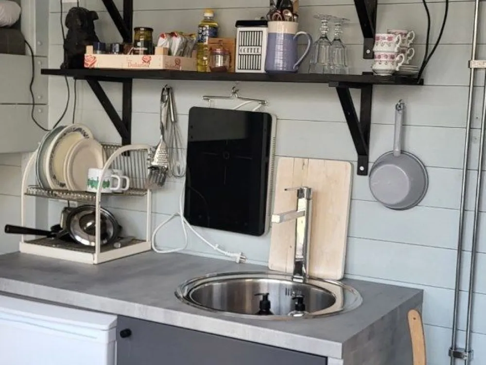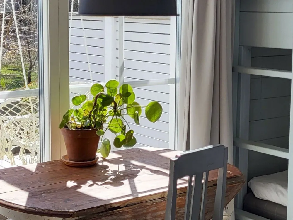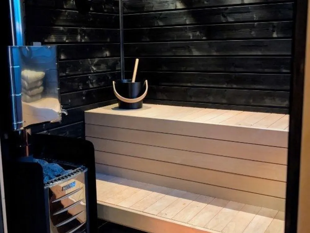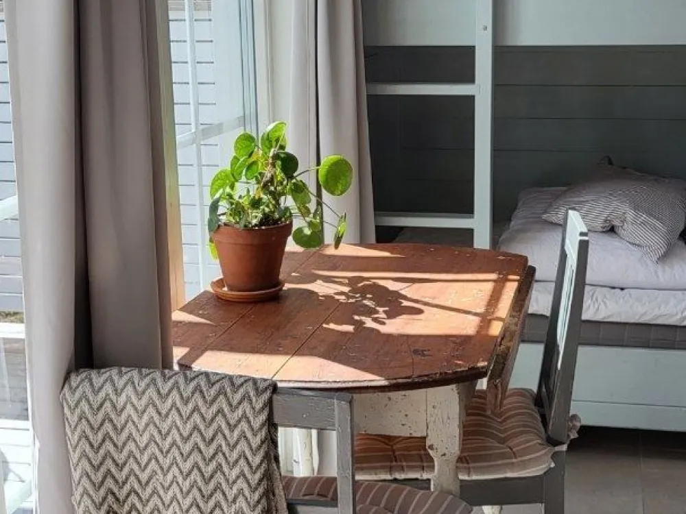 Living area with two built-in 80 cm wide beds, kitchenette with a small fridge and freezer compartment, a hotplate, and a coffee maker. Dining area for two people. Inside the cottage, there is a shower and a wood-fired sauna. Outhouse toilet.