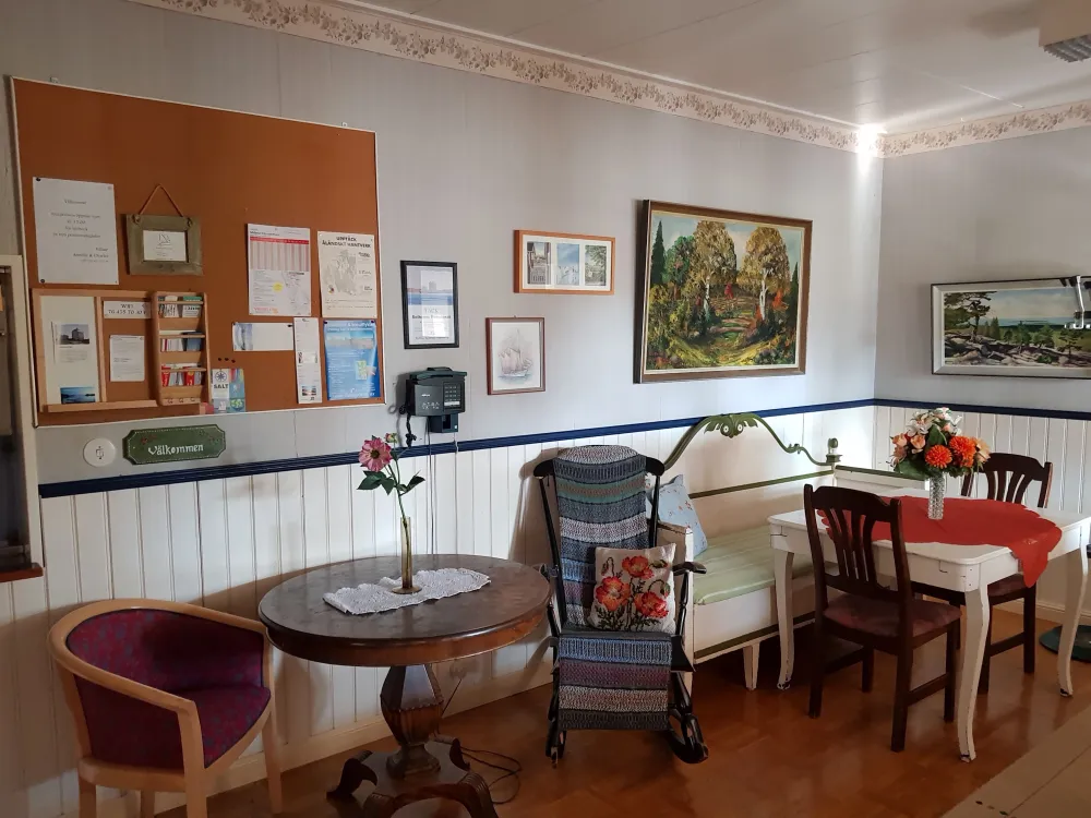 I pensionatets gula huvudbyggnad ligger receptionen och den hemtrevliga matsalen. I boendepriset ingår alltid en traditionell och god frukost. Lunch, middag och kvällsmål för grupper mot förhandsbokning annars middagsservering (buffé) för ”enskilda gäster” under tiden 6.7-2.8.2026 (v. 28-31) mot förhandsbokning senast samma dag kl. 11.00.